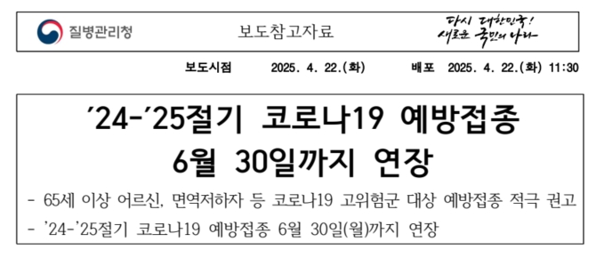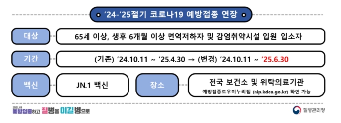 이런 상황에서 질병관리청은 2024-2025 절기 코로나19 예방접종 기간을 오는 6월 30일까지 연장하기로 결정했습니다. 당초 4월 30일 종료 예정이었지만, 고위험군의 낮은 접종률과 여름철 유행 가능성을 고려해 접종 기간을 두 달 더 늘린 것입니다.